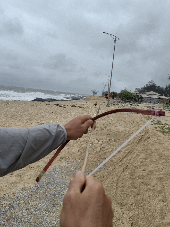 The image depicts a coastal scene in Thuận An Ward, Vietnam, under a uniformly overcast grey sky. In the immediate foreground, two hands are visible. The left hand, partially covered by a grey long-sleeved garment, grasps a curved, dark red stick, which serves as a bow, strung with a white cord. A lighter, straight stick, resembling an arrow, is positioned within the bow. The right hand holds the end of this lighter stick, pulling it back as if preparing to launch it. Directly beneath the hands, a circular pattern of light-colored tessellated squares is embedded in the sand. The midground reveals a wide sandy beach with distinct vehicle tracks and scattered debris. A line of dark, cylindrical objects, possibly wave barriers, is visible along the waterline, where the rough sea exhibits white-capped waves breaking towards the shore. A series of utility poles, each topped with a streetlight, extends along the beach, parallel to the coastline. A single, sparse tree is also visible on the sand further down the beach. In the background, an orange vehicle, possibly construction equipment, is situated on a dirt path behind the utility poles, adjacent to some low-lying, rudimentary structures and sparse vegetation. The horizon line where the turbulent sea meets the grey sky is visible.