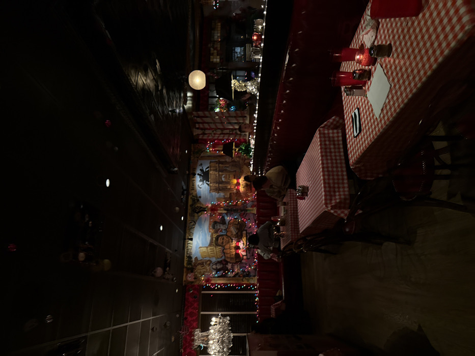 A dimly lit restaurant features red and white checkered tablecloths atop multiple tables. Diners are present at some tables, while others are set with condiments and order pads. A colorful mural covers a wall adorned with Christmas lights, and hanging chandeliers add to the festive atmosphere. The restaurant appears to be traditionally styled.
