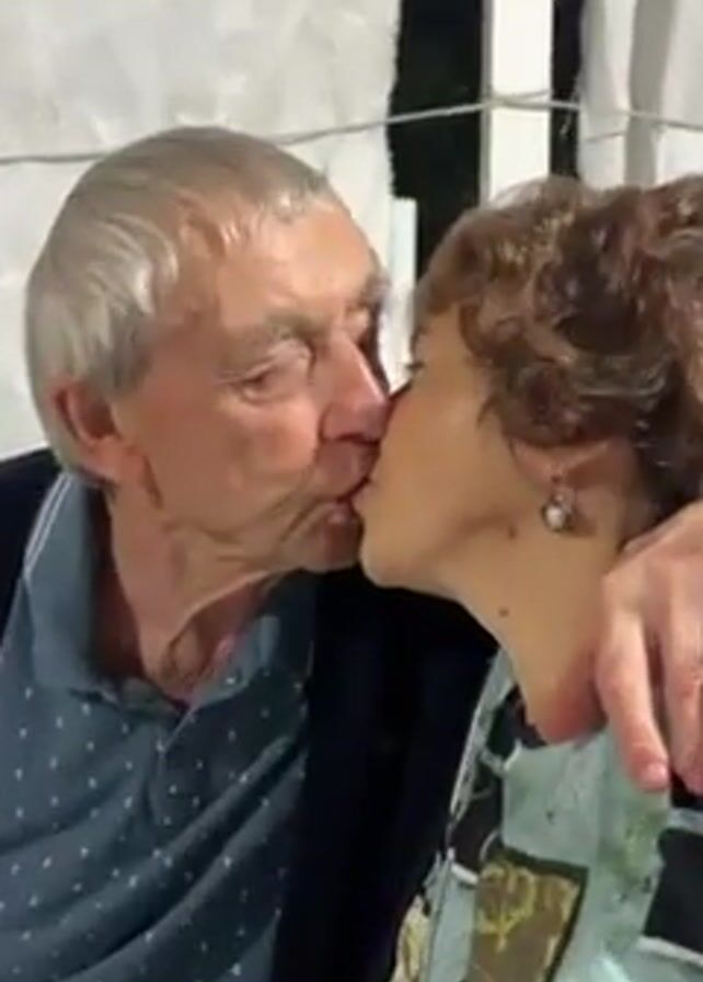 n elderly couple kissing in what appears to be an outdoor setting. The man is wearing a blue cardigan over a patterned shirt, and the woman is wearing a turquoise patterned shirt. They are seated at a table with plates visible. The background includes a white tarp or curtain. After kissing, the woman smiles at the camera. The man then looks at the woman, and she touches her face.
