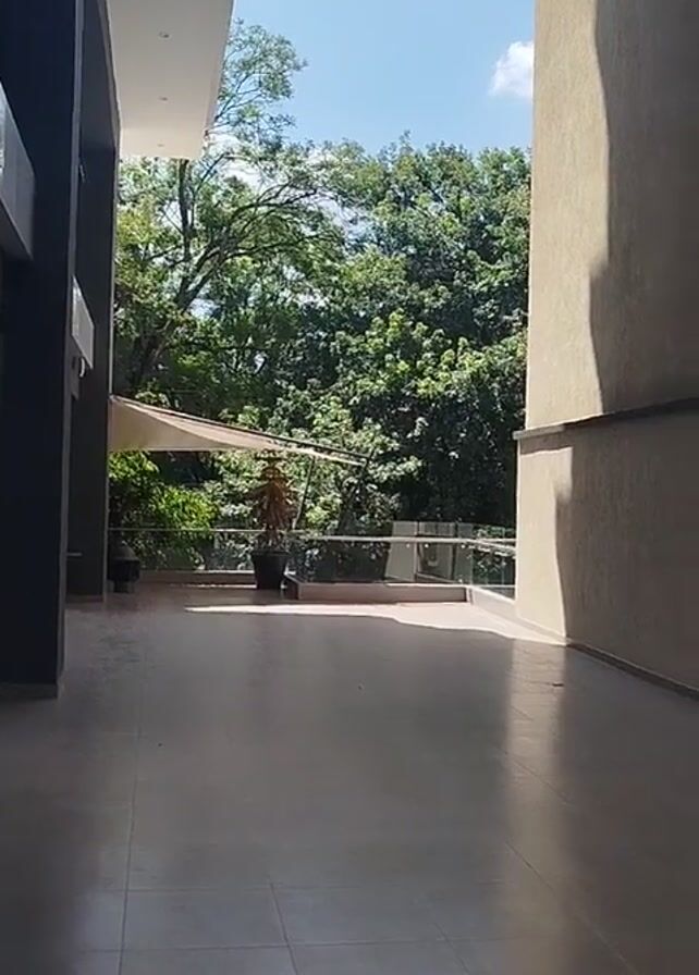 view through a modern building's corridor leading to an outdoor area with lush greenery. The corridor has a light-colored tile floor and is flanked by walls of differing designs – one dark and angular, the other light and textured. The corridor is partially covered by the building's overhang, providing shade. The exterior space features a glass railing and is shaded by a large awning. A potted plant sits within the space. Beyond the railing, a dense forest with tall, green trees dominates the view under a bright blue sky with scattered clouds. The video is stable, and there's no evident movement or activity in the scene.