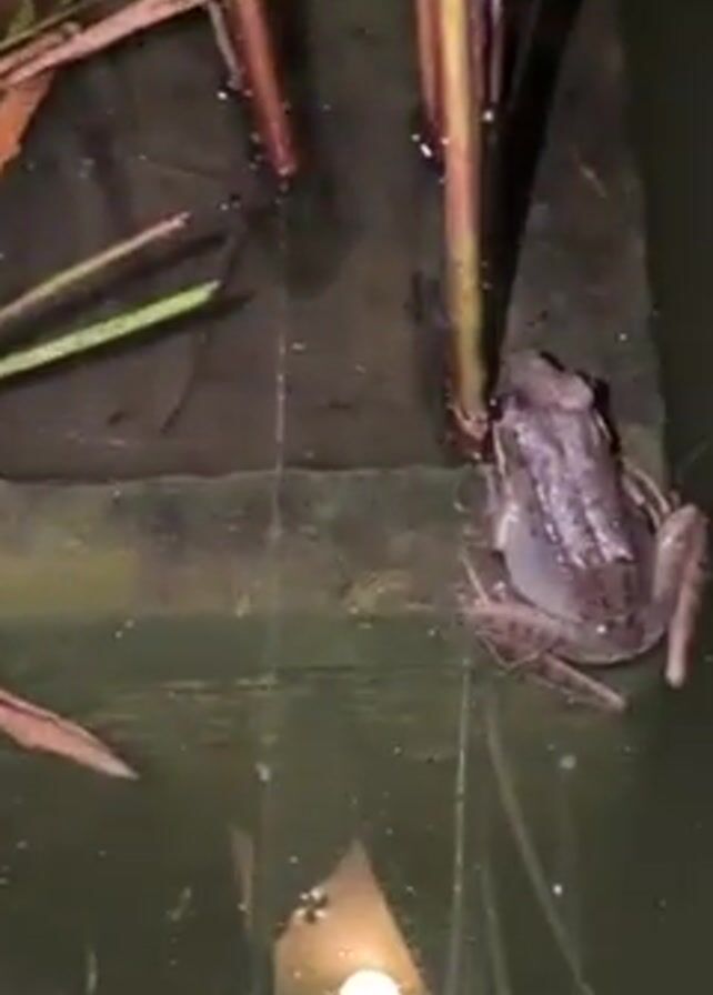 dimly lit pond. A gray rectangular object with plants growing on it sits in the water. There is a crab and a frog on the object. A voice in the video says, "Looks like a proper fighter tonight, right?"