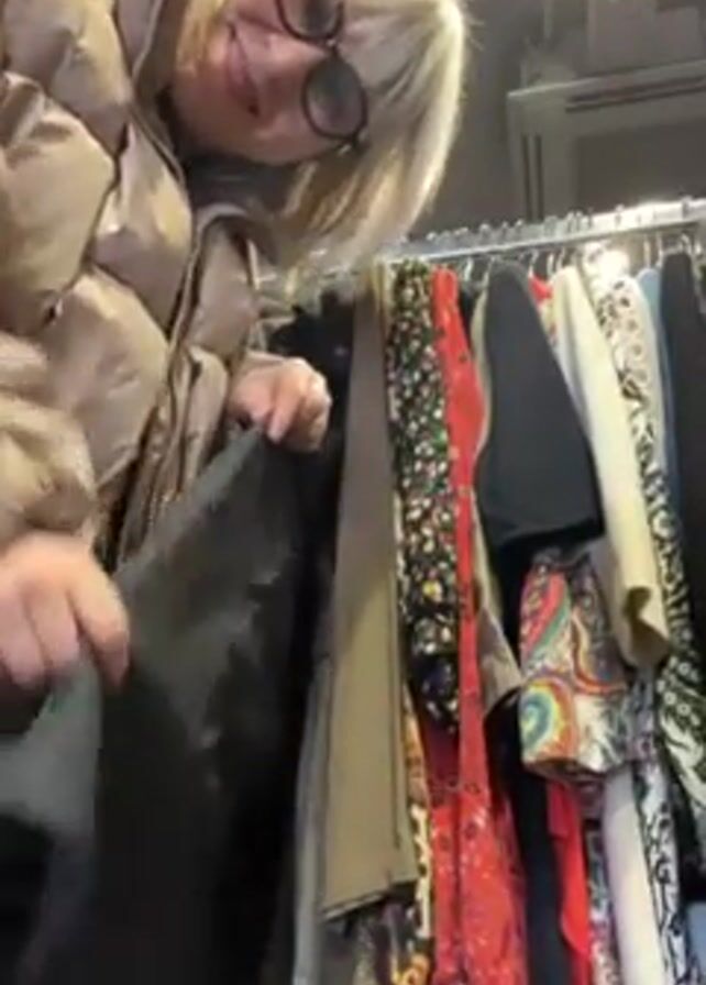 A woman with blonde bangs and glasses is standing in front of a clothing rack. She is wearing a beige puffer jacket. She picks up a gray garment from the rack and holds it up briefly. Then she continues to rummage through the clothes on the rack. The clothing on the rack consists of various dresses, skirts, and tops in different colors and patterns. The background is out of focus, but it appears to be a store.