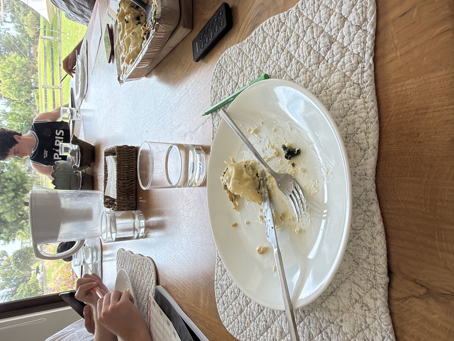 A dining table showcases remnants of a meal. A partially eaten lasagna sits in an aluminum tray. An empty white plate holds leftover food, marked by a knife and fork. A drinking glass, napkin holder, and water pitcher add to the tablescape. A TV remote lies nearby. Several people are seated around the table, one wearing a 'PARIS' tank top. A window reveals a green outdoor view.