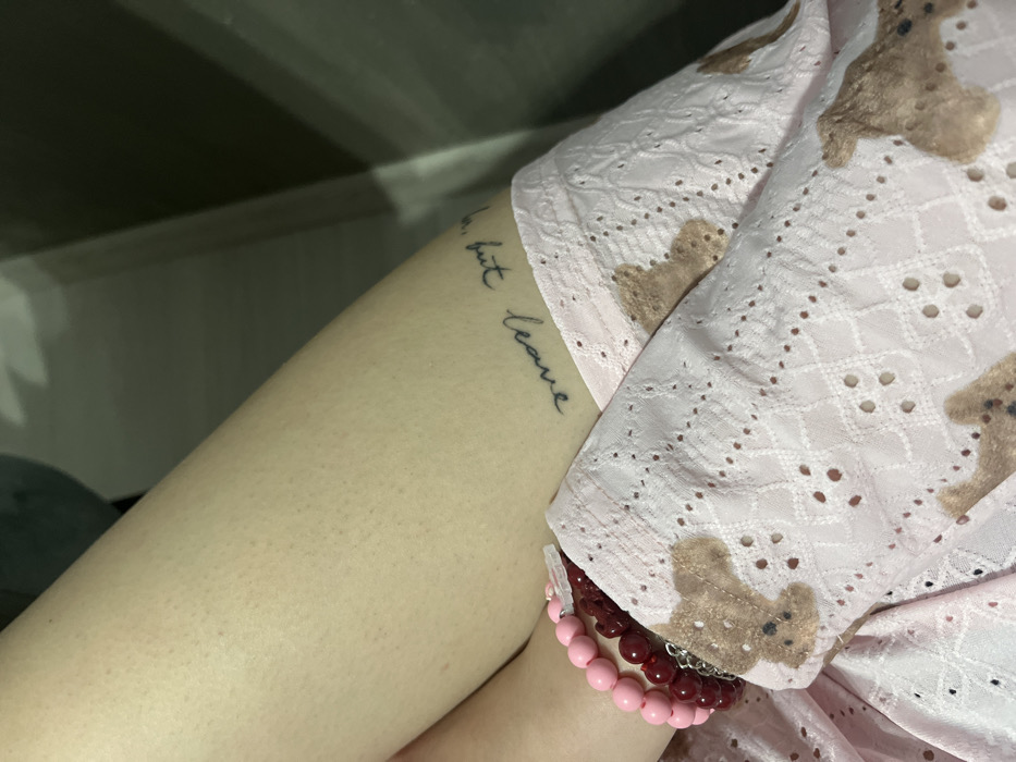 The image depicts a close-up, angled view of a person's upper thigh and lower arm/wrist in an indoor setting, presumed to be in Plovdiv, Bulgaria. The subject's fair-skinned upper thigh displays a horizontal tattoo in script font, partially visible, reading "but leave." The skin exhibits minor follicular openings. A light pink garment, possibly a robe or blouse, featuring eyelet embroidery arranged in a diamond pattern and repeating brown teddy bear head motifs, covers the lower portion of the thigh and the person's lower arm and wrist. Two beaded bracelets are worn on the wrist: one composed of solid pink spherical beads and another of darker, possibly burgundy-colored, irregularly shaped beads. A small, clear, faceted object, possibly a charm, is attached to the pink bracelet, alongside a metallic chain or clasp. The background is uniformly dark and out of focus, providing no discernible environmental details.