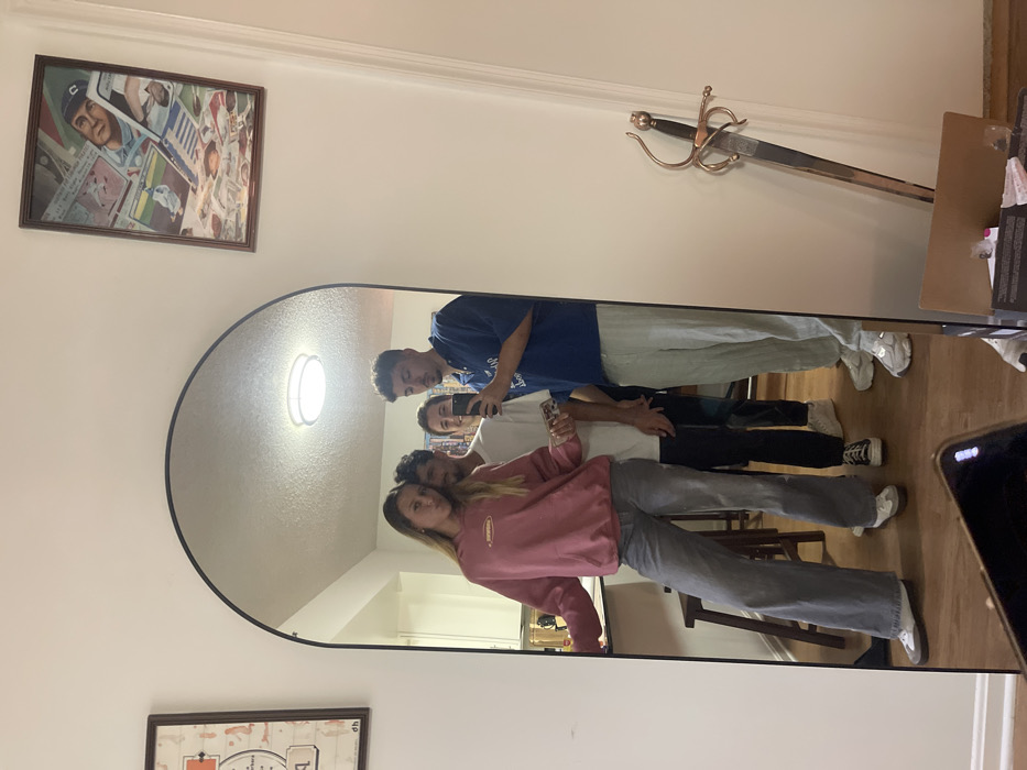 The image displays an indoor residential scene, capturing four individuals in a selfie reflected within a large, arched mirror with a thin black frame