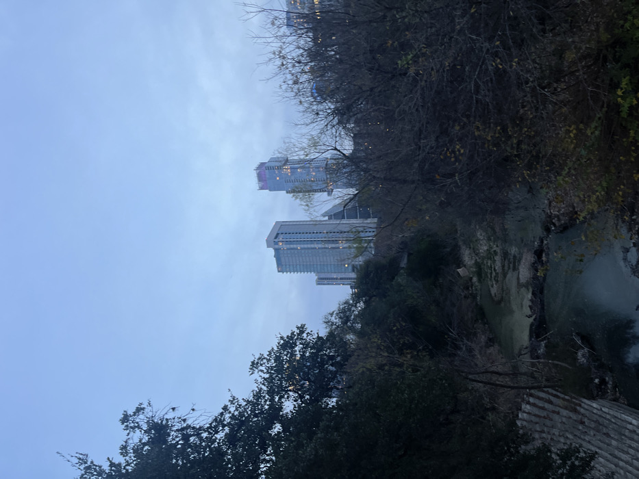 The image displays a cityscape viewed from a lower elevation, framed by foliage. Two prominent high-rise buildings are visible against a cloudy sky. The surrounding landscape includes dense trees and a body of water, possibly a river or lake. Some structures, possibly parts of buildings or walls, are visible in the foreground near the bottom right corner of the frame. The overall tone suggests a blend of urban and natural environments, with the skyline merging with the natural landscape.