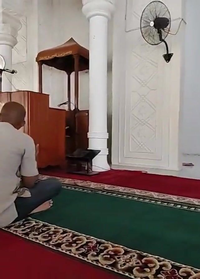 mosque interior. Several men are seated on a green and red patterned carpet. Most of the men wear traditional Muslim caps. A wooden pulpit is centered in the view. White columns line the interior. Fans are attached to the walls. A man is standing at the back of the room.