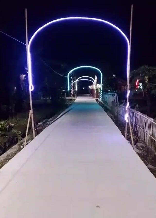 long, straight, white concrete path lit up at night. Arches of colored neon lights are placed along the path, creating a tunnel-like effect. The first arch closest to the viewer is illuminated in blue. In the distance, two more arches can be seen, glowing in teal and red. The arches are supported by bamboo poles. The path is bordered by lush vegetation and simple wooden fences. The overall scene is festive and creates a sense of inviting passage.
