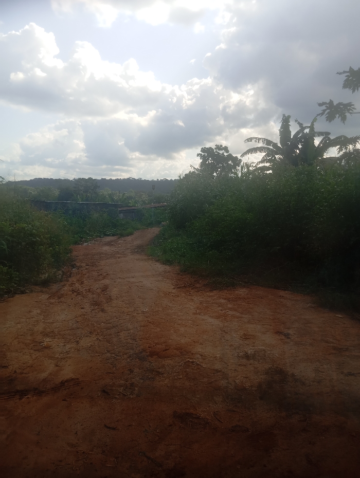 The image depicts a rural or semi-rural unpaved dirt road under a partly cloudy sky, located in the city of Unknown, Unknown