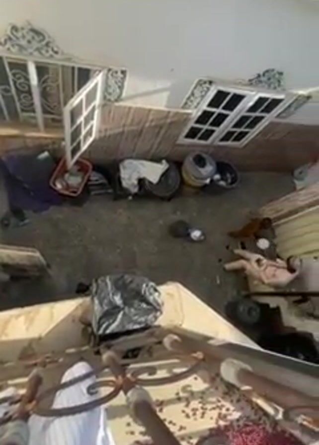 A video shows a high angle view into a cluttered courtyard. The courtyard has a tiled wall on one side and a wrought iron fence along the viewpoint. On the ground are numerous red beans scattered near the fence. Further into the courtyard there are discarded containers, bags of trash, and other clutter. Two men are sitting in the corner of the courtyard against a wall with a partially drawn curtain. Both men are wearing traditional Muslim attire. One man is eating from a plate. The courtyard has at least two windows with metal security bars. The camera is stationary and pans slightly to follow the movement of one of the men sitting in the courtyard.