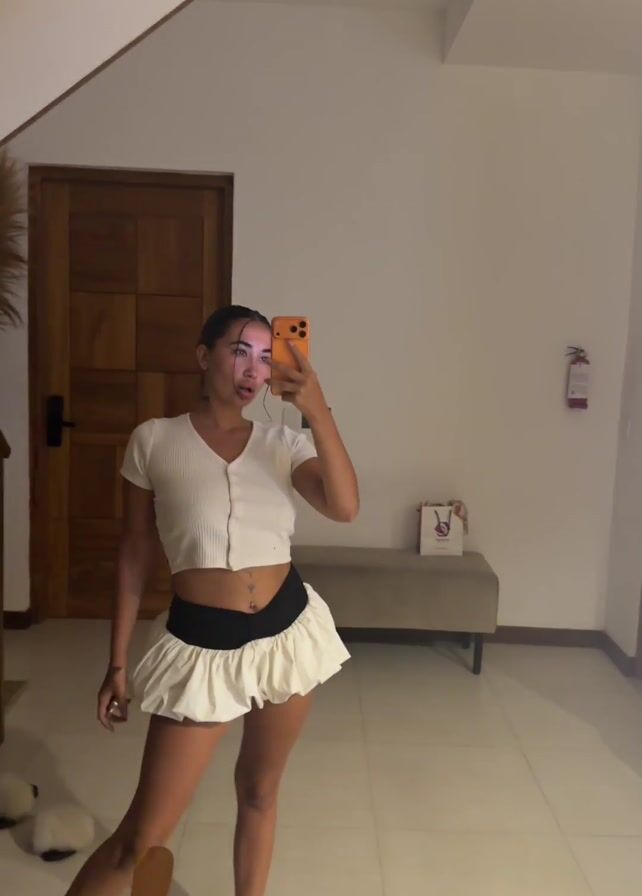 A woman in a white top and short white ruffled skirt with a black waistband stands in front of a mirror in what appears to be a hotel room