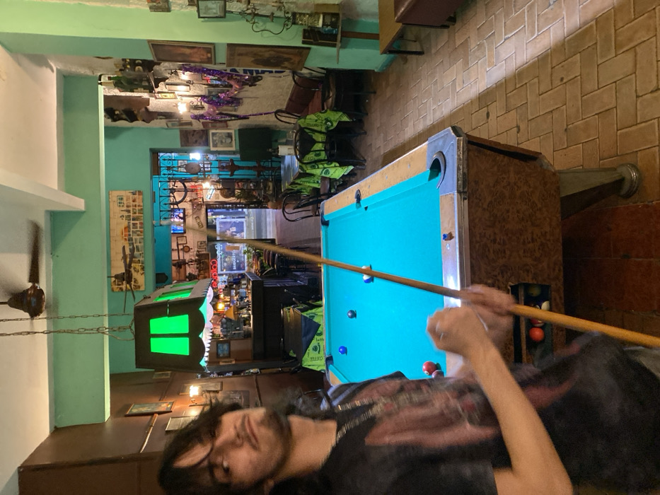 A man plays pool in a vintage bar. A pool table with several balls sits in the center. The bar's interior is dimly lit, decorated with various artifacts. A vintage-style pool table light hangs above the bar. The man is mid-shot. The camera angle is low, partially obscuring the bar's interior, which leads to a bright outdoor scene through an open doorway.