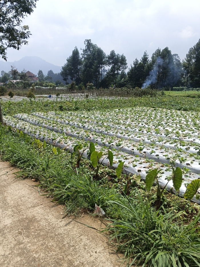 A rural scene showcases a vast field cultivated with crops covered in white plastic sheeting. Lush green foliage and tall grass line the edge of the field. A weathered, concrete path runs alongside the field, contrasting with the vibrant vegetation. In the background, a mountain range is visible amidst towering pine trees, with a wisp of smoke adding a touch of intrigue. A single building is partially visible in the distance.