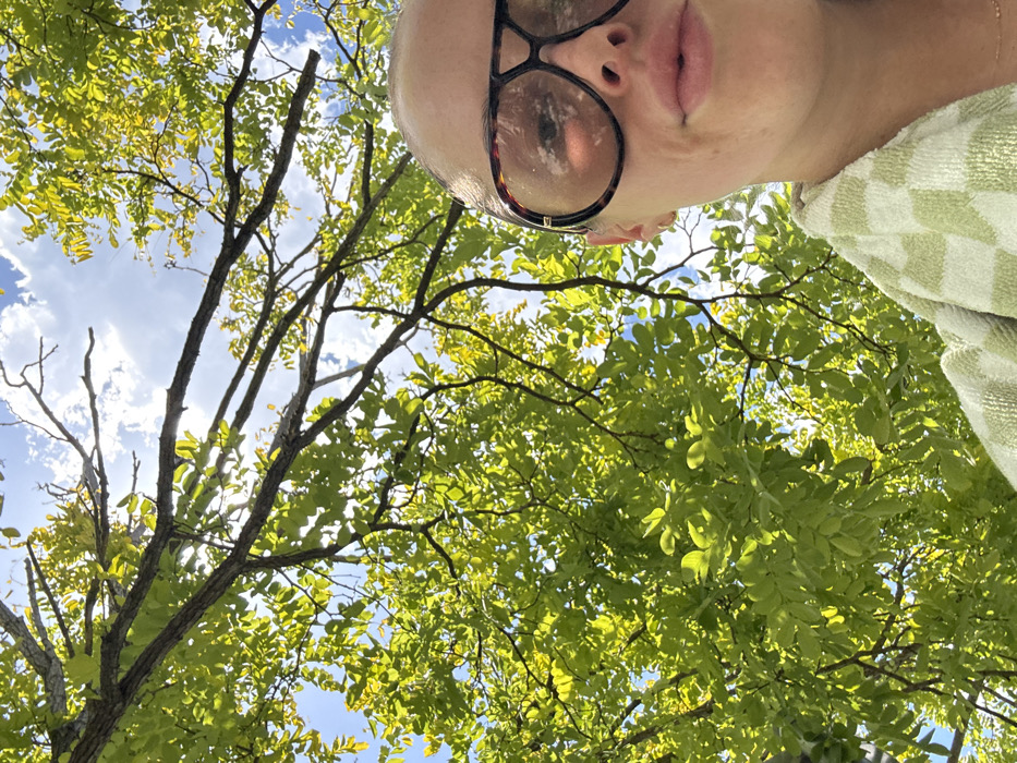 A low-angle, upward-facing perspective captures a person wearing glasses and a patterned shirt, with green trees filling the background