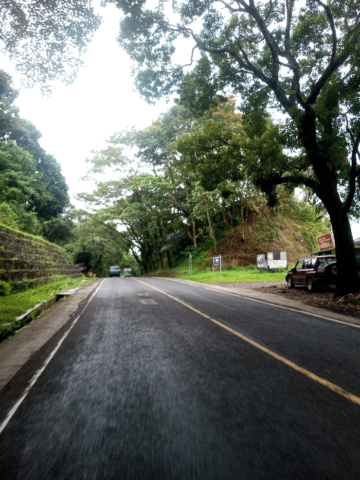 The image depicts a two-lane asphalt road in Kamji Na-Yekha, Bhutan, under an overcast sky. The road surface appears wet, marked by a solid yellow line on the right side of the visible lane and a white line bordering the far left. The road ascends slightly and curves gently to the left in the distance. On the left side of the road, a stone retaining wall is topped with green vegetation, primarily grass and small plants. A concrete drainage ditch runs parallel to the road between the wall and the asphalt. Beyond the retaining wall, dense green forest covers a rising slope. On the right side, a steep, heavily vegetated hillside rises, featuring prominent green foliage and exposed brown earth. A large tree with a thick, dark trunk and extensive green canopy dominates the right foreground and mid-ground. At the base of the hillside, near the road shoulder, are two small, rudimentary structures, one appearing white and the other exhibiting graffiti. A maroon SUV or pickup truck is parked on the right shoulder, partially obscured by the large tree trunk; another vehicle is visible behind it. Two signs, one dark and rectangular, and another with red lettering on a white background (partially obscured), are visible on the right shoulder. In the distance, on the road, two vehicles resembling vans or SUVs are visible, traveling away from the viewer. No people are present in the scene.