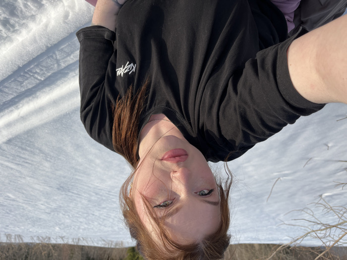 The image depicts a female individual in a close-up self-portrait, set in Павловка, Russia. She is approximately 20-35 years old, with reddish-brown hair styled partially up with a ponytail, green eyes with visible eyeliner, and pink lipstick. Her attire includes a black short-sleeved t-shirt featuring a white 'KIZAL' logo on the left chest. The individual holds the camera with her outstretched left arm. The background is a snow-covered outdoor environment under bright sunlight, featuring bare tree branches to the left and distant dark vegetation or trees lining the horizon. Parallel tracks are imprinted in the snow on the right side of the frame.