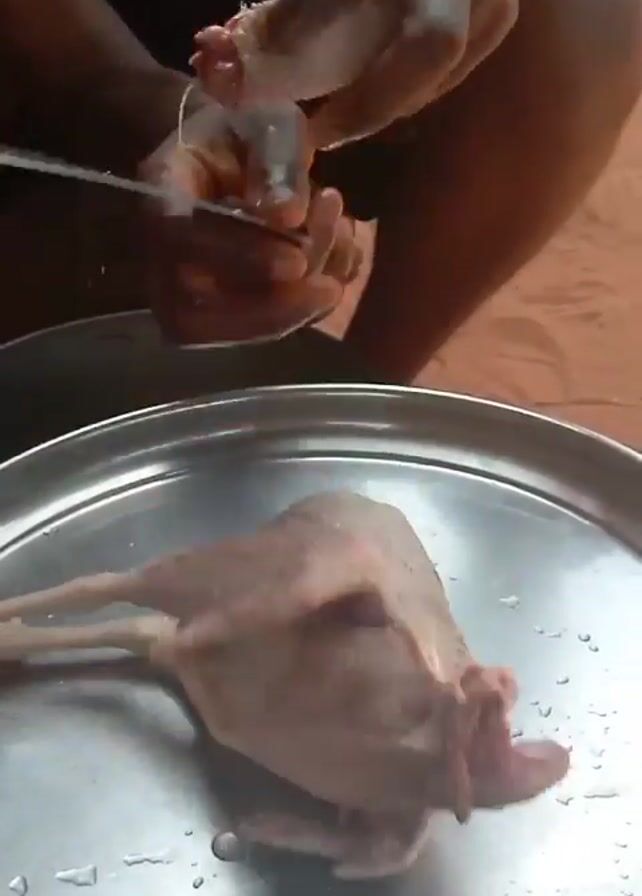 - "A person is butchering a chicken on a metal tray" by FM-m0BBE2, licensed under CC BY 4.0