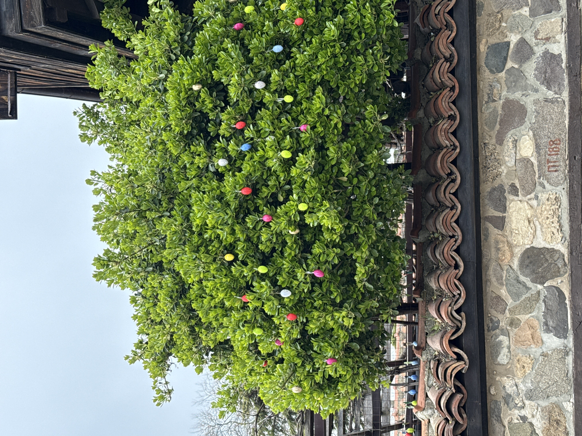 A tall, green, leafy bush or tree is decorated with colorful Easter eggs, standing in front of a stone wall in Sozopol, Bulgaria