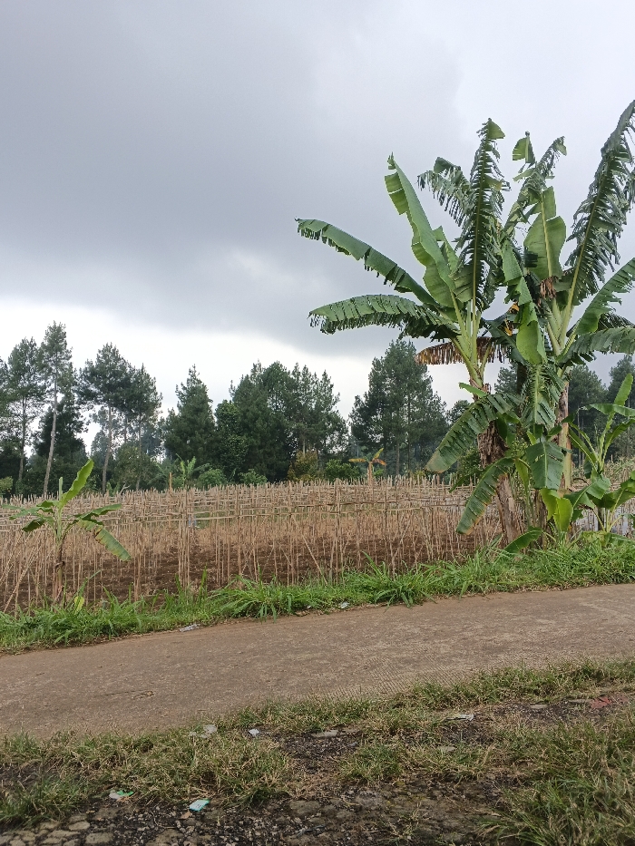 A rural scene features a road in the foreground with grass and litter along the edges. A banana tree stands on the right, its large leaves partially obscuring a field planted with rows of short, dry stalks supported by a bamboo fence. A line of pine trees is visible in the background under a cloudy sky, suggesting an overcast day. The terrain appears to be slightly hilly.