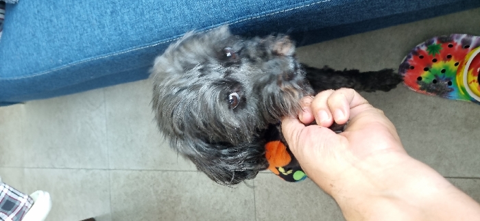 A black terrier-like dog looks up with pleading eyes while a hand gently cups its face