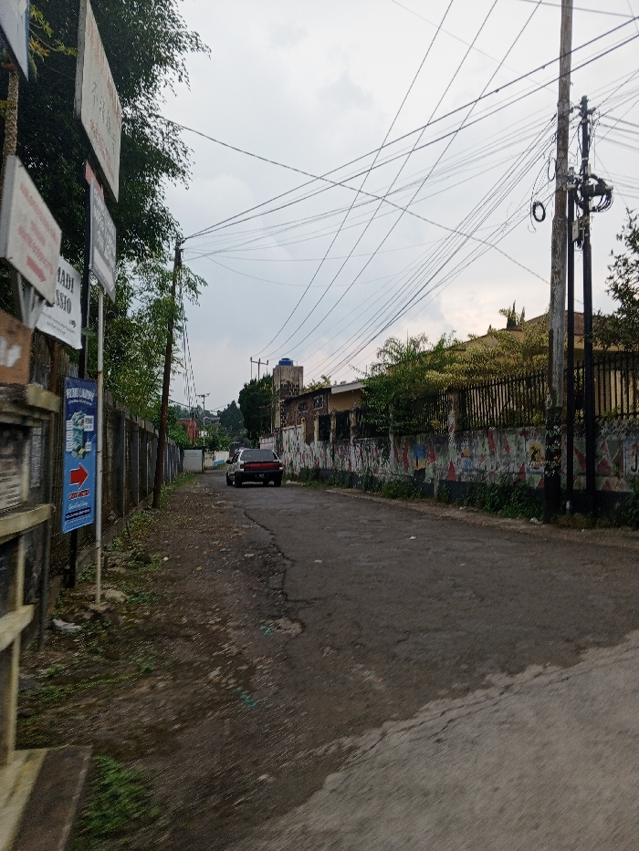 This image depicts a street scene in the city of Kheda, India. The view extends down a narrow, uneven asphalt road that recedes into the background under an overcast, light gray sky. On the left side of the foreground, several rectangular signs are mounted on poles. A blue sign with a white right-pointing arrow and "PROMO LAUNDRY" text is visible, along with a white sign displaying "MADI SSIO" in black text. A tall, dark utility pole stands to the left, supporting a dense array of overhead electrical and communication wires that crisscross the upper portion of the frame. Behind the signs, a dark fence or wall extends along the road, partially obscured by green foliage. A dark-colored sedan with a lighter trunk lid is positioned on the right side of the road, facing away from the viewer, approximately one-third into the image. No individuals are visible on the street. Along the right side of the road, a low wall is heavily covered with faded posters, graffiti, and advertisements in various colors. Behind this wall, a dark metal fence and a mix of green and yellowish-green foliage are present, with parts of buildings visible beyond. In the background, additional utility poles are discernible, further contributing to the complex network of overhead wires. A building featuring a blue water tank on its roof is visible on the distant left side of the road. The environment is urban or semi-urban, characterized by worn infrastructure and varied vegetation.