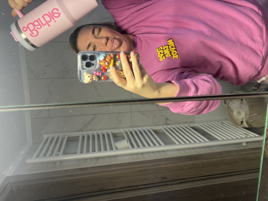 A woman with her tongue out takes a mirror selfie, holding a pink tumbler with "Barbie" written on it