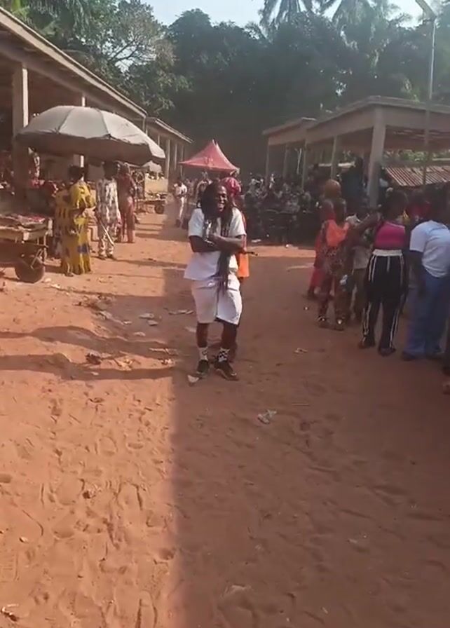 person dressed in white shorts and a white t-shirt, wearing a necklace and headpiece, performing in a dirt-covered open area. The person is holding what appears to be a circular fan-like object. A crowd of people is gathered under covered areas and standing around, watching the performance. Some people are sitting. There are trees and a red tent in the background. The lighting is bright. The person in white moves toward the crowd, dancing and engaging with people nearby. The overall setting seems to be a public gathering or event.