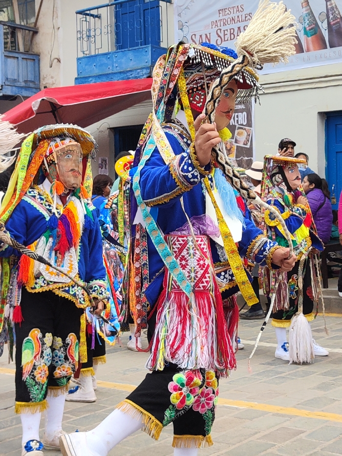 Two people in vibrant, traditional costumes are featured. The attire includes blue jackets, black pants adorned with colorful floral and bird designs, and elaborately decorated headwear with tassels and ribbons. Both individuals wear masks with exaggerated facial features. They are holding sticks with tassels or decorative elements. A crowd is visible in the background, suggesting a parade or cultural event in front of buildings.
