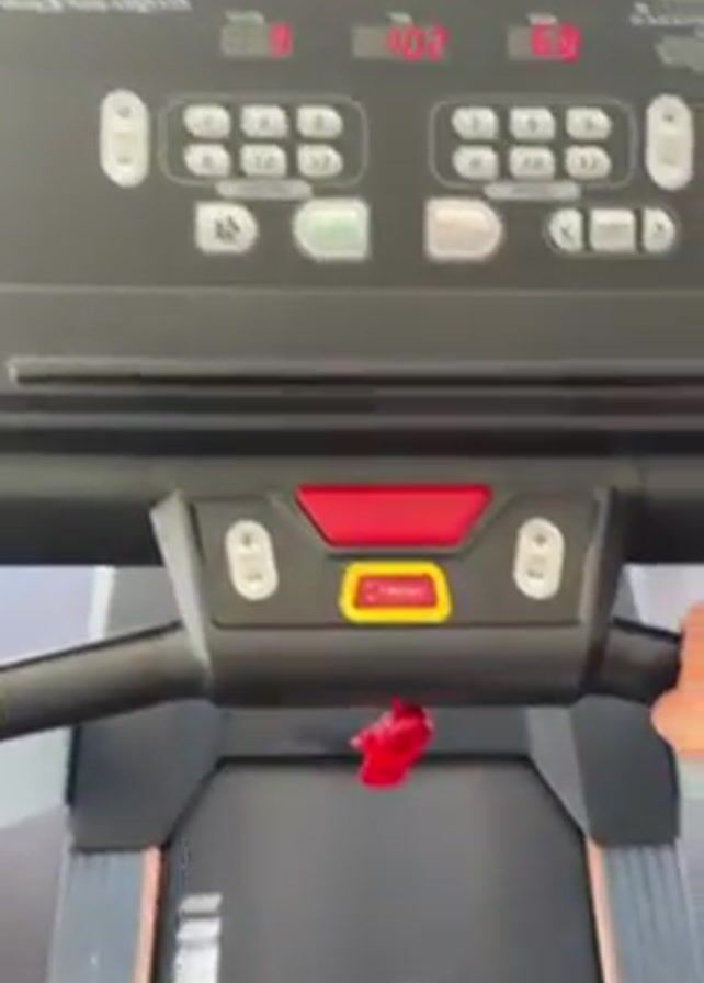 A person wearing gray athletic shoes and white socks is walking on a treadmill. The treadmill has a black console with red digital displays showing time, speed, and distance. There are also buttons for various functions. The person is holding onto the handles of the treadmill. A red safety key hangs from the console. The background shows a window with palm trees visible outside.