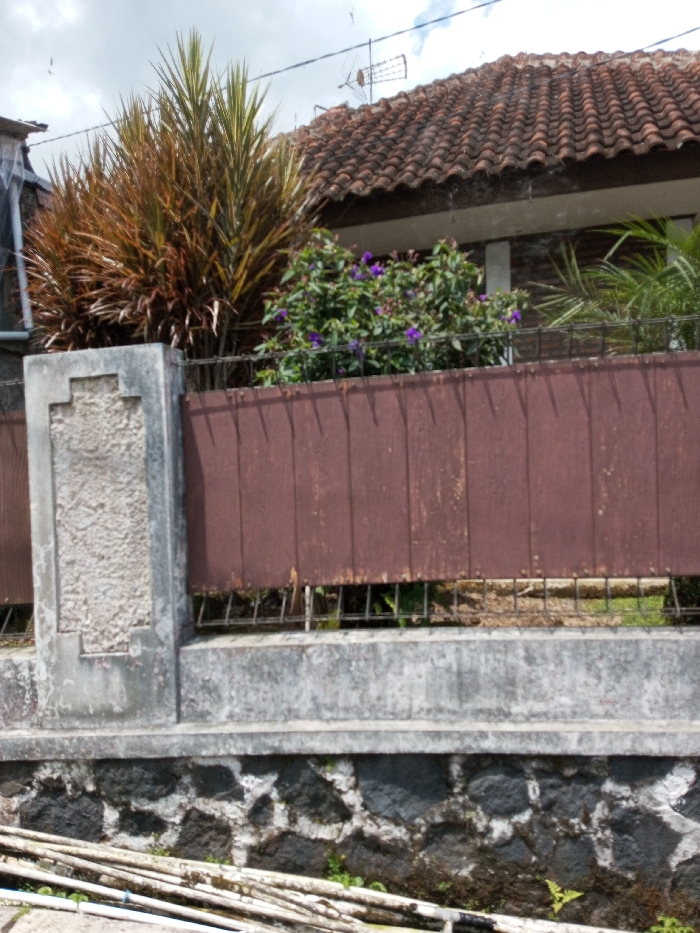 The image depicts an exterior scene within the city of Viengthong, Laos, focusing on a property boundary. In the immediate foreground, several light-colored cylindrical objects, possibly pipes or bamboo, lie horizontally on disturbed ground. Below these objects is a wall constructed of dark, irregularly shaped stones mortared with a lighter material, from which small green plants emerge. Dominating the midground is a fence structure. Its base consists of a light grey concrete retaining wall. Above this, the fence transitions into a section composed of vertical, dark reddish-brown panels, likely wood or metal, which are affixed between light grey concrete posts. The leftmost visible concrete post features a decorative, recessed rectangular panel with a cross-like design in textured lighter grey material. A dark metal grid is visible beneath the reddish-brown panels, above the concrete base. Behind the fence, varied vegetation is prominent, including two large plants with reddish-brown and green variegated leaves, and a bush displaying numerous small, vivid purple flowers. Further in the background, a building is partially visible, identifiable by its reddish-brown, terracotta-tiled roof and a segment of a white structure beneath the eaves. An outdoor antenna is mounted on the roof. The sky overhead is partially cloudy with patches of blue and white. No individuals or discernible activities are present in the scene.
