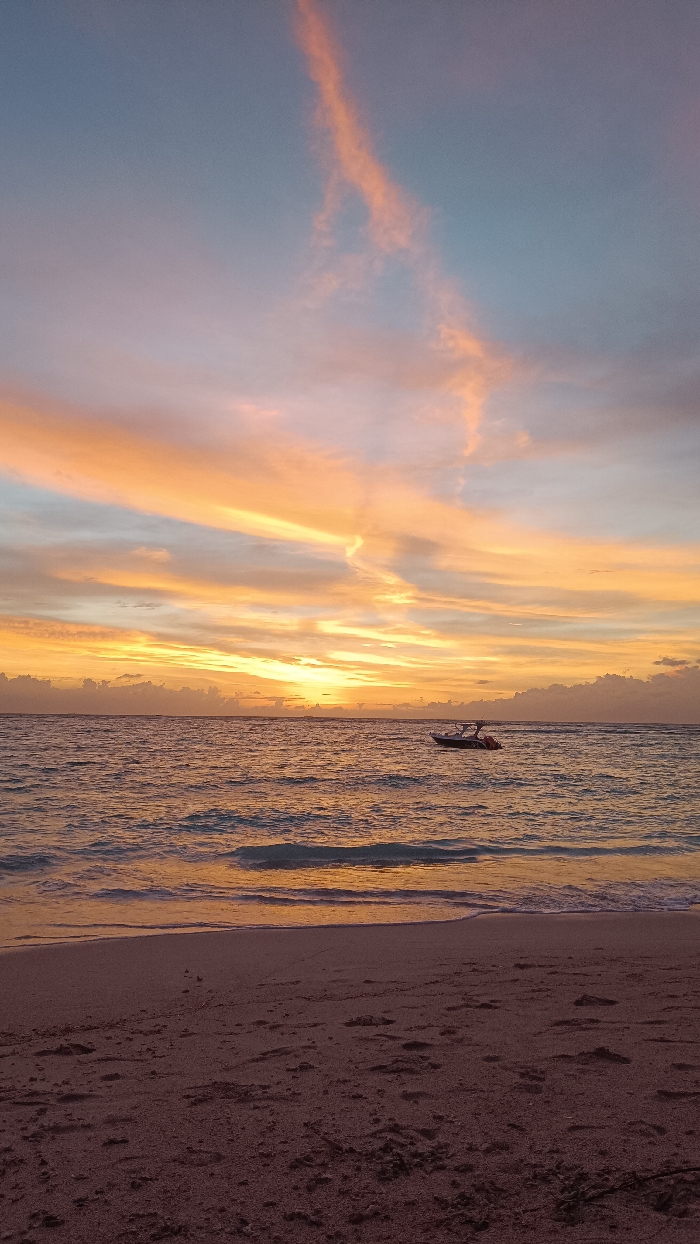 This image depicts a sunset over a beach in Unknown, Indonesia. The sky occupies approximately the upper two-thirds of the frame, displaying a gradient of colors including light blue, soft pink, orange, and yellow. Stratiform clouds, some elongated and wispy, are present, with the sun's bright orange-yellow light emanating from just above the horizon line in the center-left. The sea surface, occupying the middle ground, reflects these sunset colors, appearing as a mix of dark blue-grey and orange-yellow. Gentle waves are visible, with a distinct waterline separating the ocean from the sandy beach. A single dark-hulled motorboat, with a light-colored cabin area, is anchored or drifting in the mid-ground water, positioned slightly to the right of the frame's center. The foreground consists of reddish-brown sand, showing multiple footprints and debris, indicating a beach environment. No human figures are visible in the scene.