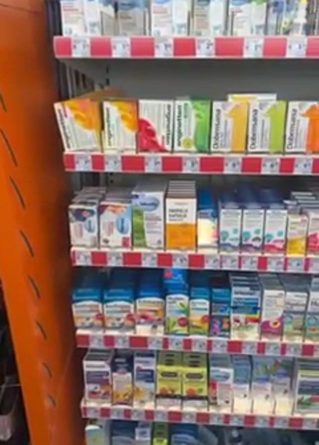 camera panning across shelves stocked with over-the-counter medications and supplements in a pharmacy or drugstore