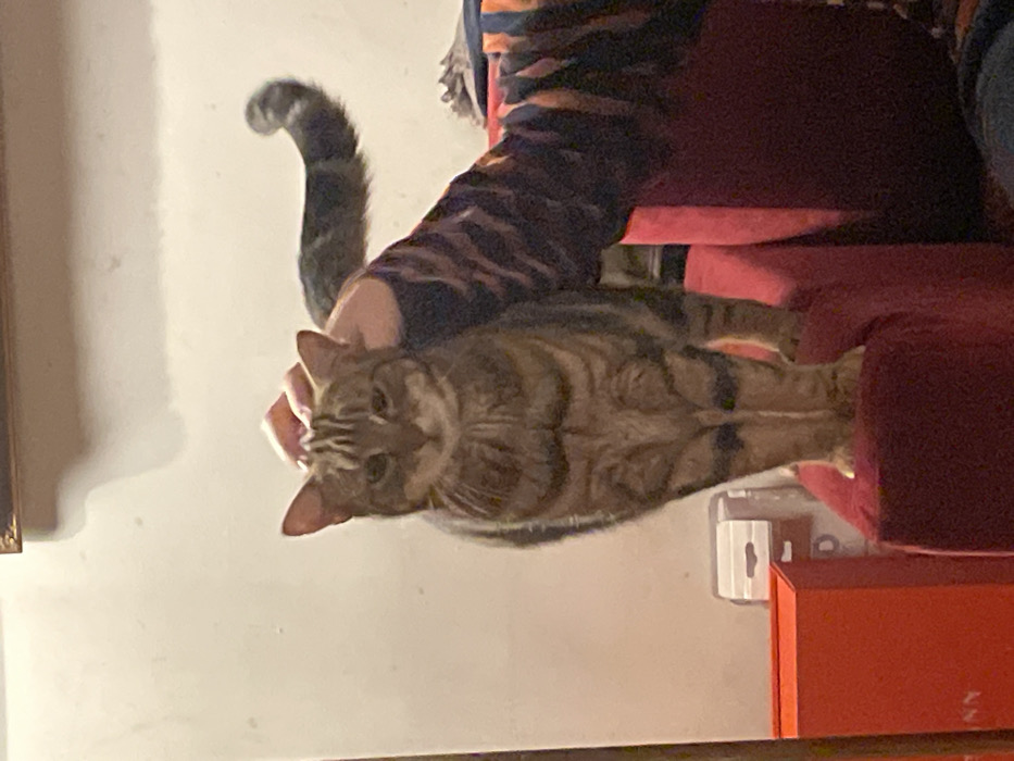 This image depicts an indoor scene in the city of Cucuron, France. A domestic short-haired tabby cat with brown and darker striped fur stands upright on a red upholstered surface, likely a sofa or armchair, facing directly towards the viewer. A human hand is visible petting the cat's head, with a segment of the human's arm, clad in a striped garment (alternating orange and dark blue/black), extending from the right side of the frame. The cat's tail is raised and curves upwards to its right. The immediate background is a plain, light-colored wall. Partially visible objects include a dark-framed item at the top edge of the image, a tall red rectangular object in the lower left, and a small white wall-mounted dispenser located on the wall behind the cat's lower body.