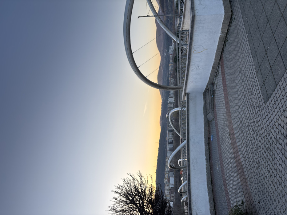 The image presents an outdoor scene in Kardzhali, Bulgaria, at a low sun angle, likely dawn or dusk. The foreground features a paved area constructed from interlocking grey and red-brown pavers. A white concrete retaining wall, approximately 1.5 meters high, borders this paved section and displays various scribbled graffiti, including a prominent yellow heart outline. A light blue plastic bottle is visible on the ground at the base of the wall. To the far left, a portion of a bare, dark-branched tree is visible. The midground is dominated by the Arda River Bridge, a prominent structure characterized by a series of multiple white or light-colored arch-shaped steel elements. These arches are interconnected and supported by visible tension cables. A metal railing is present along the bridge's edge. Beyond the bridge, a dense urban landscape of multi-story buildings extends towards the base of distant, undulating hills or mountains. The sky above transitions from a clear, deep blue at the zenith to a warm orange-yellow near the horizon line. No individuals, vehicles, or active interactions are depicted within the scene.