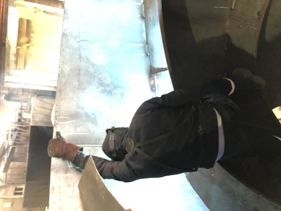 An industrial scene is depicted indoors, presumably within a fabrication facility in Zaljevo, Montenegro. The primary subject is a single individual, viewed from the back, engaged in welding. The individual is wearing a dark, heavy-duty jacket, dark trousers with a white stripe visible on the lower right leg, and a welding helmet with the visor down. A brown welding glove covers their right hand, which is raised, holding an obscured welding tool against a metal surface. Intense blue-white light and sparks are emanating from the point of contact, indicating an active arc welding process. The welder is positioned inside a large, dark, metallic cylindrical structure, possibly a section of a tank or pipe, with visible weld seams on its interior surface. The background shows blurred industrial elements, including what appears to be a workshop or construction area with partial structures, possibly scaffolding or covered materials, and an overhead ceiling or roofline. The overall lighting is dominated by the bright welding arc against a dimly lit industrial interior.