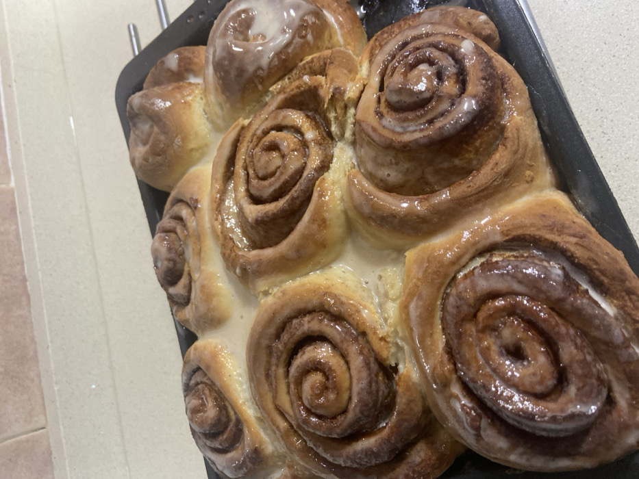 - "The scene depicts a close-up, high-angle view of a dark-colored rectangular baking pan containing a cluster of approximately nine freshly baked cinnamon rolls, located on a light-colored countertop in an indoor setting, likely a kitchen, in Urbanización Encinares De Alcolea, Spain" by FM-RYz862, licensed under CC BY 4.0