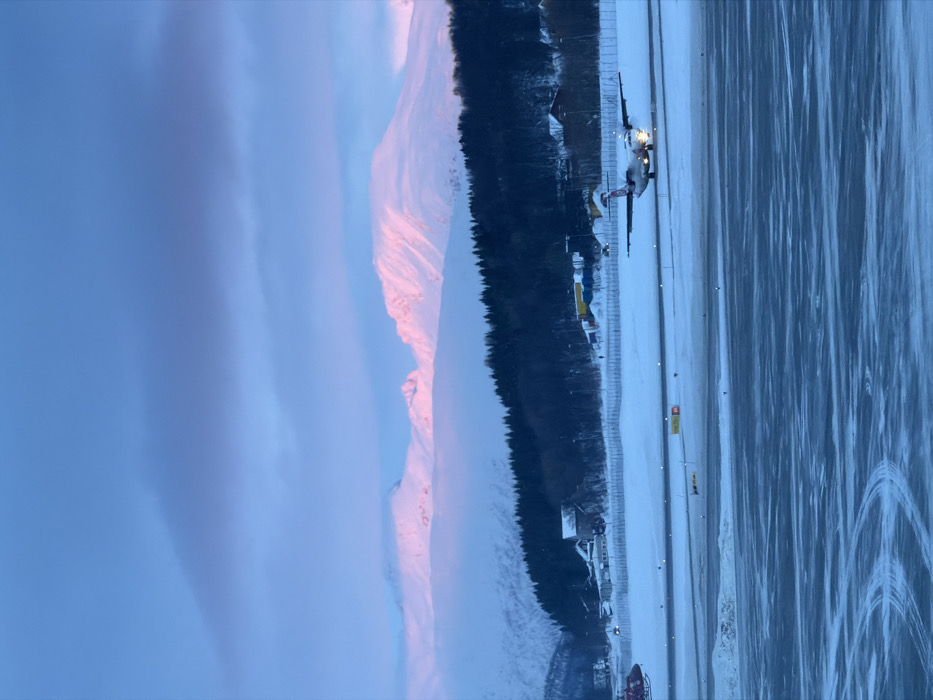 An aerial photograph or a view from an elevated position captures Tromsø Airport (TOS) in Tromsø, Norway, under winter conditions. The scene is dominated by a snow-covered landscape under a twilight sky, possibly sunrise or sunset, evidenced by the pervasive blue light and a distinct pink glow illuminating the upper portions of snow-capped mountains in the background. In the mid-ground, a white turboprop aircraft, possibly a regional airliner, with red markings on its tail and engine nacelles, is stationary or slowly taxiing on a snow-dusted asphalt taxiway. Its landing lights or taxi lights are actively illuminated, projecting light forward. Various yellow and red ground markers and taxiway lights are visible along the paved surfaces. To the left of the aircraft, near the airport perimeter, a red object, potentially a helicopter or ground support vehicle, is partially visible. The immediate foreground consists of a snow and ice-covered surface, showing faint tire tracks. Behind the airport infrastructure, a dense line of dark coniferous trees forms a band, separating the airport from the rugged, snow-covered mountainous terrain. Several buildings, appearing to be houses or airport facilities, are interspersed within the tree line and along the base of the mountains. The mountain peaks are heavily covered in snow, receiving a warm pink reflection from the low sun, contrasting with the overall cool blue ambient light. The sky above is a gradient of blue, with darker gray cloud formations present. No specific individuals are clearly identifiable.