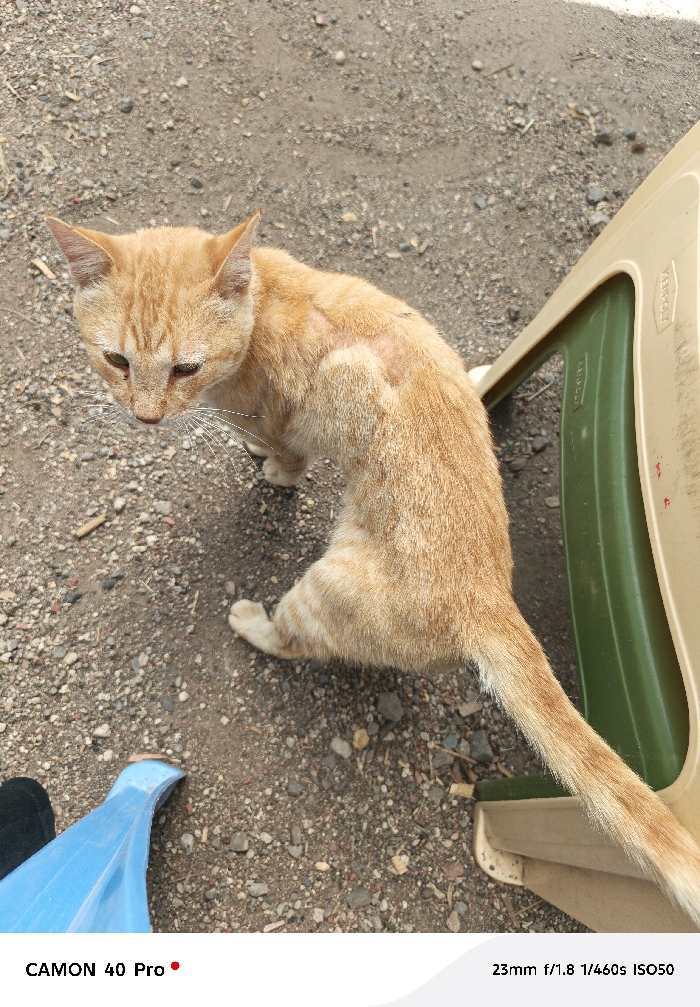 An orange tabby cat is positioned on an unpaved ground composed of gravel and dirt. The cat, exhibiting a lean physique, has predominantly orange fur with lighter cream accents and prominent white whiskers. A distinct patch of fur loss and visible skin irritation is present on its left flank/shoulder area. The cat's head is angled downwards and slightly to its left, its eyes partially closed, giving it a somewhat somber appearance. Its body is curved, with its tail extended towards the right. To the cat's right, the lower section of a beige plastic chair with a green plastic seat is visible. In the lower-left corner of the frame, a partially obscured blue plastic object, possibly a slipper or container fragment, is present next to a black fabric item, suggesting human proximity. The scene is illuminated by natural daylight. This observation takes place in the city of Oloosirkon/Sholinke ward, Kenya.