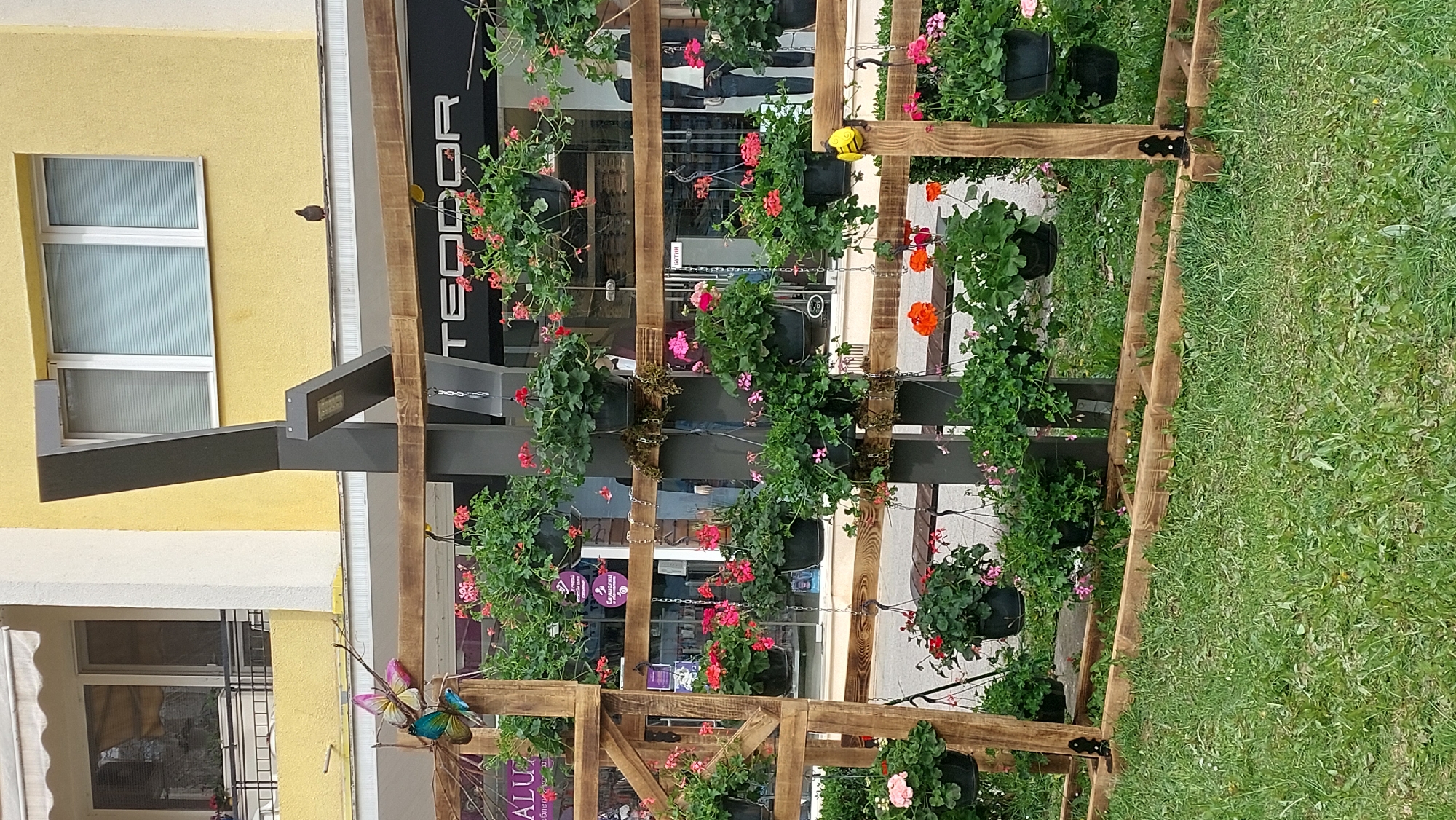 The image depicts an outdoor scene in Vratsa, Bulgaria. The foreground features a wooden structure adorned with hanging flower pots containing various geraniums in bloom, including red, pink, and orange varieties. The structure appears to be a decorative vertical garden installation positioned on a sidewalk or pedestrian area. In the background, there is a building with a yellow facade, white window frames, and a metal support structure with sign boxes attached. The word "TEODOR" is prominently displayed above the flowers. Patrons can be seen shopping in the background. The presence of grass in the background indicates the adjacent area is a lawn or park. The scene is illuminated by natural daylight, suggesting a daytime setting.
