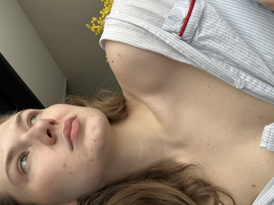 A young adult female is depicted from the upper chest upward, angled slightly to her left, in an indoor setting. Her fair skin exhibits multiple acne lesions primarily on her jawline, chin, and lower cheeks, along with several small moles on her shoulders and upper chest. Her light brown, wavy hair is visible on the left side of the frame. Her left eye, light in color, is visible as she gazes upwards and to her left with a neutral expression, her lips slightly parted. She wears a light blue and white striped shirt or pajama top, unbuttoned at the top, exposing her left shoulder, collarbone, and upper chest. The shirt features a breast pocket with a thin red trim along its upper edge. In the background, to the right of her head and behind her right shoulder, is a cluster of yellow, spherical flowers, resembling mimosa, positioned against a light grey wall. A dark, possibly structural, element is visible in the upper background. The lighting appears natural, originating from the subject's left. The specific location in Matyushino, Russia, cannot be determined from the visual information provided in the image.