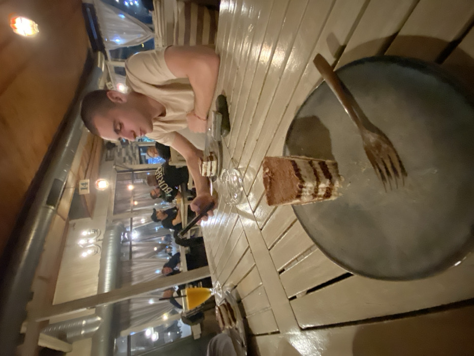 The image depicts an indoor scene within a restaurant or cafe in Tsalapitsa, Bulgaria, at night. The environment features dimly lit, warm lighting, wooden slat tables, and overhead exposed ductwork with decorative chandeliers. White curtains cover windows in the background, revealing distant exterior lights. In the immediate foreground, a slice of multi-layered cake, resembling tiramisu with white cream layers and brown dusting, rests on a round, dark gray plate. A used, bronze-colored fork lies on the plate to the right of the cake. In the midground, a young male with short, dark hair, wearing a light beige t-shirt, is seated at a wooden slat table. He is holding a dark smartphone with both hands, looking down at its screen, and appears engaged with the device. A thin red bracelet is visible on his right wrist. On the table directly in front of him are an ashtray and a dark rectangular object, possibly a phone case or wallet. To his left, another slice of the same type of cake is on a white plate, and further left, a tall glass containing an orange beverage is visible. In the background, several other patrons are seated at various tables, largely indistinct due to the distance and lighting. One individual wears a black t-shirt with "BURBERRY" printed on the back. A white sign with the number "14" is affixed to a ceiling support in the background.