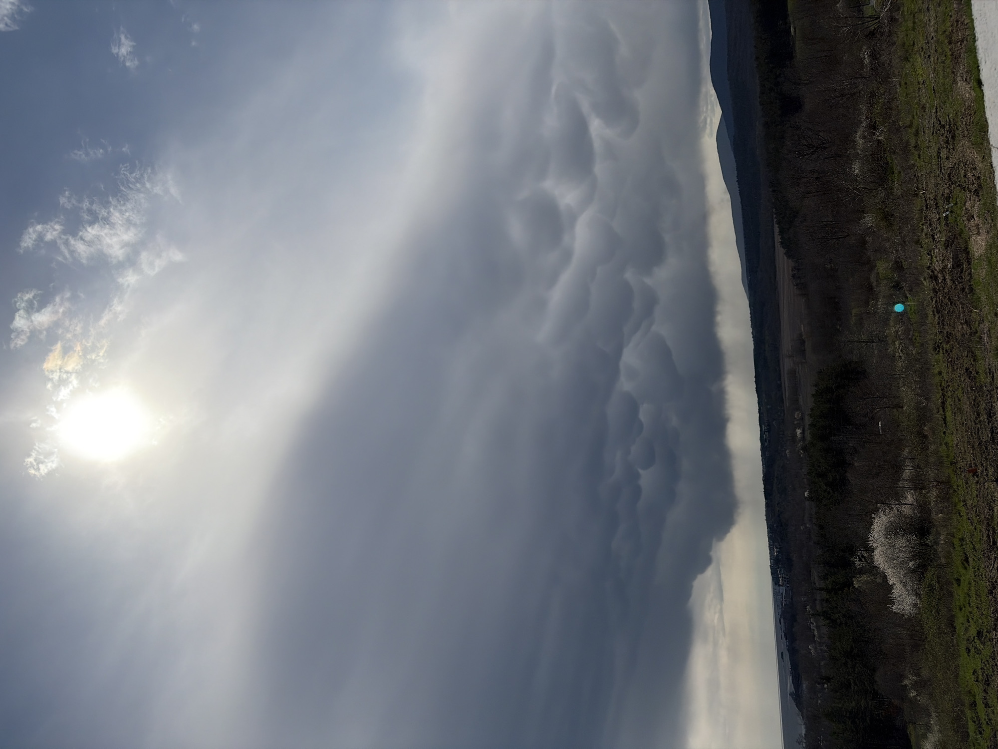 landscape under a dramatic sky. The sky is dominated by large, rolling, dark gray clouds, with some resembling mammatus clouds. A bright sun is visible through the clouds, emitting rays of light. On the right side of the image, a band of land is visible, densely vegetated with trees and grass. The location is not identifiable as Kiten, Bulgaria from the visible elements.