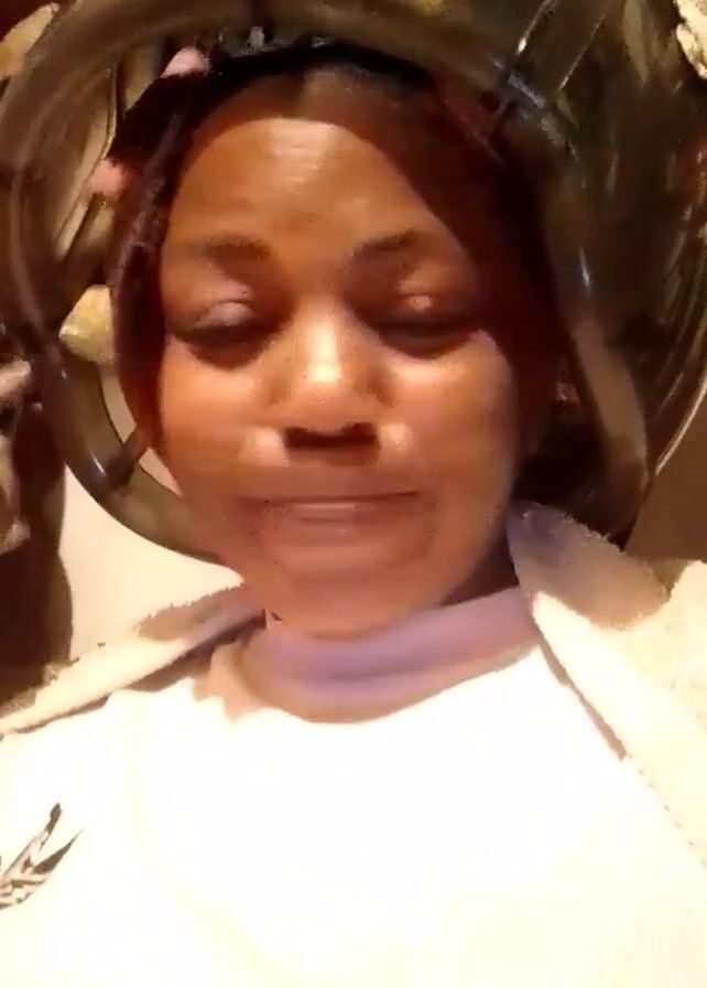 A head-and-shoulders shot presents a woman sitting underneath a hair dryer, her eyes open as she gazes at the camera