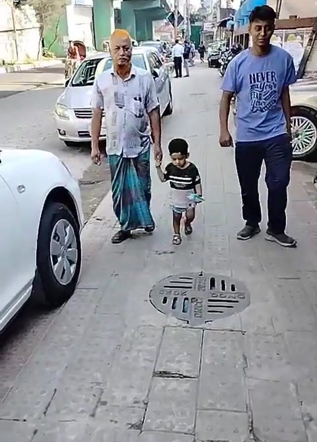 On a city sidewalk, an elderly man with orange hair, a young boy holding a toy car, and a younger man walk toward the camera. The old man holds the boy's hand. All three look at the camera. The sidewalk is made of grey paving stones. Cars are parked on the street beside the sidewalk. A rickshaw and several other people are visible in the background. A bridge or overpass is in the upper left of the frame.