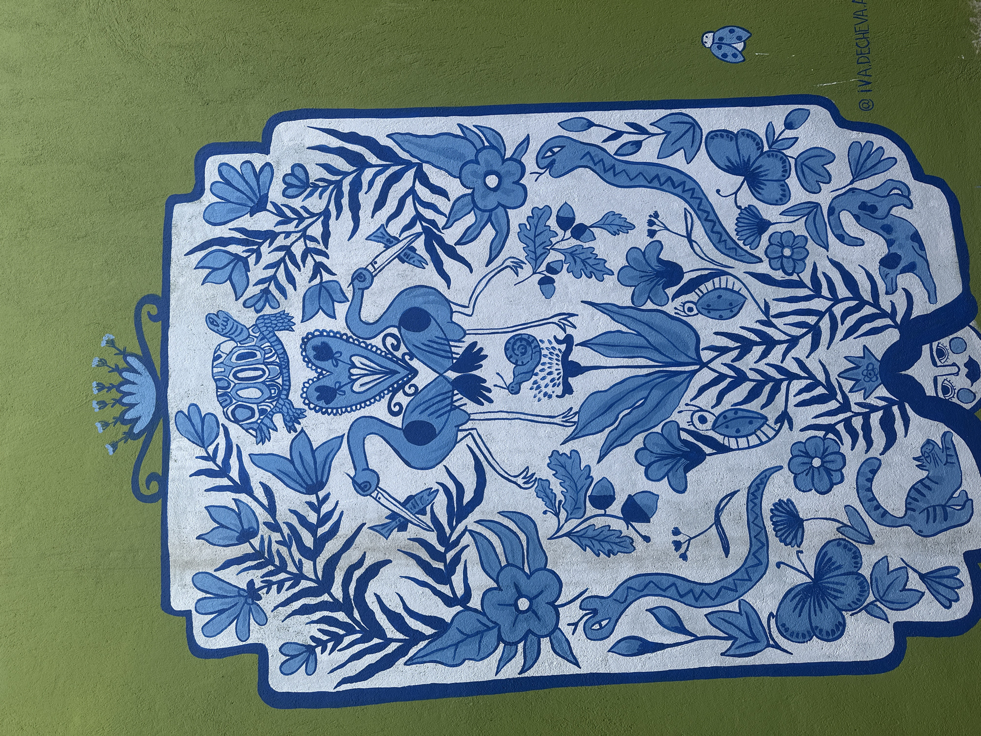 A large, intricate mural is depicted on a textured, olive-green wall in Sofia, Bulgaria