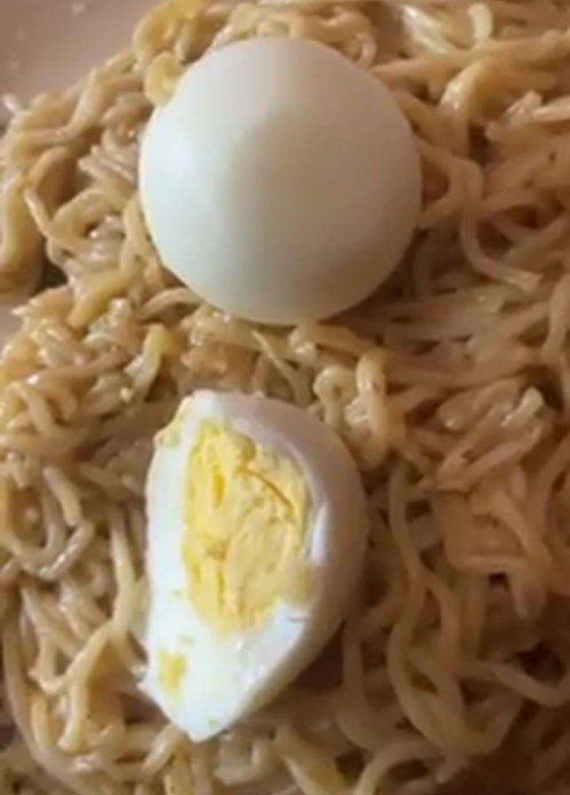 close-up shot of a plate of food. The plate contains a pile of cooked noodles and two hard-boiled eggs. One egg is whole, and the other is cut in half. A spoon can also be seen on the plate. The food appears to be prepared and ready to eat.