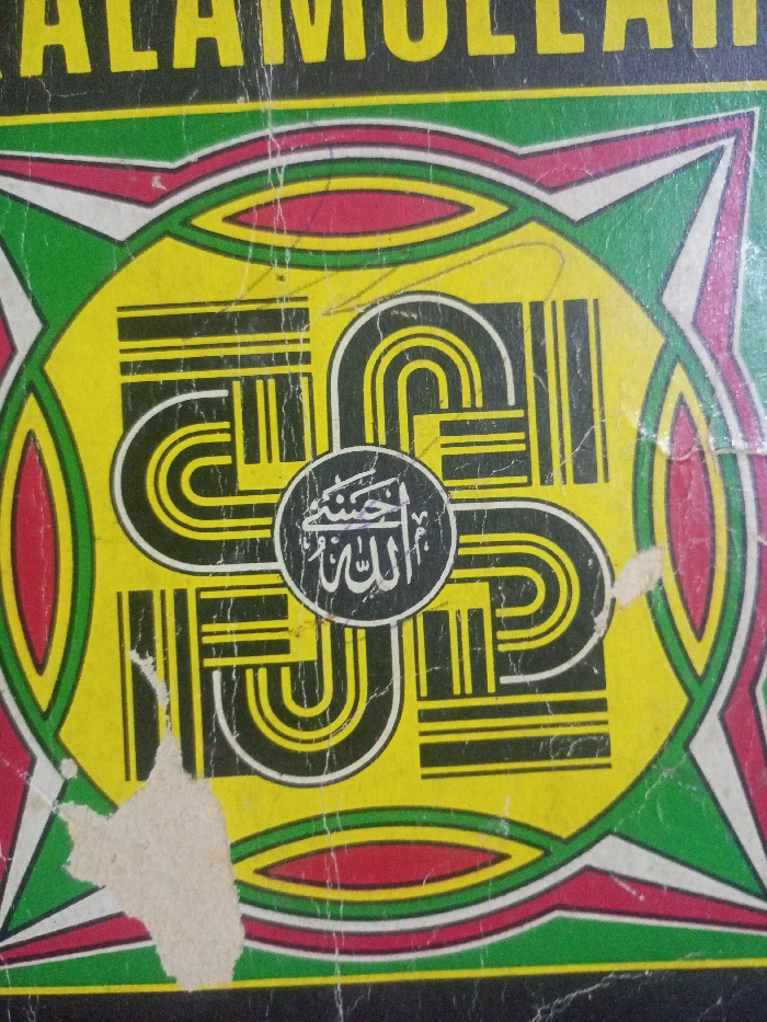 The image displays a worn, rectangular, multi-colored surface, likely a book cover, captured from a direct overhead perspective. The dominant feature is a central yellow square containing an intricate black and white interlocking geometric pattern. This pattern comprises four symmetrical, stylized elements that converge at the center, forming a design reminiscent of a square Kufic knot. At the absolute center of this geometric pattern is a circular black emblem with white Arabic calligraphy, clearly depicting "الله" (Allah) and partially visible additional text above it, possibly "حسن" (Husn) or a similar term. The central yellow square is framed by concentric borders of green, white, and red, which incorporate stylized red ovals with white outlines on the green band. The outermost background of the visible surface is black. At the top of the black background, partial yellow uppercase Latin script is visible, spelling "ALAMULLAH", consistent with the term "Kalamullah." The surface exhibits considerable wear and age. Numerous fine white creases and cracks are visible across all colored areas, particularly pronounced on the yellow. A significant, irregular tear of the top layer is present in the lower-left quadrant of the central yellow square, revealing a lighter base material. Minor chips or tears are also discernible along the green borders in the upper-right and middle-right portions of the image. No individuals, actions, or interactions are present in the image. The image contains no visual cues, landmarks, or environmental context to determine its physical location, including whether it is situated in Zee Pin Kone, Myanmar.