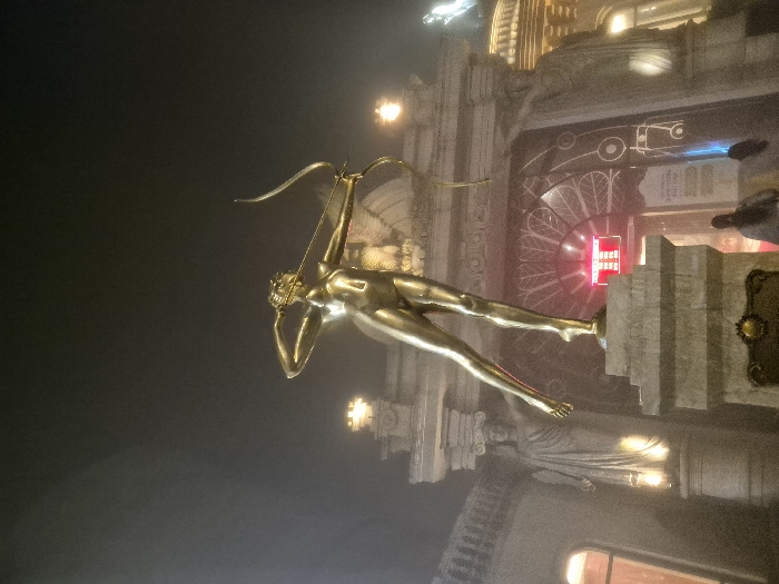 - "A large, golden, nude female archer statue, consistent with depictions of Artemis or Diana, stands centrally on a multi-tiered stone pedestal" by FM-vOprn2, licensed under CC BY 4.0