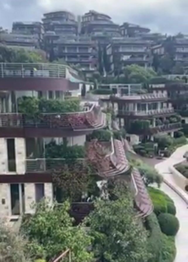 The video presents a high-angle, static shot of a tiered residential complex nestled into a hillside overlooking a beach