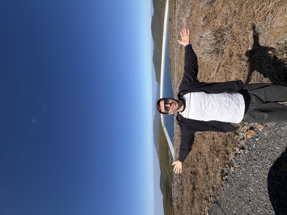An adult male stands centrally positioned on a gravel path, facing forward with arms outstretched horizontally and palms open. He wears dark sunglasses, a white t-shirt, an open black hooded zip-up jacket, and dark trousers. A faint smile is visible on his face. The ground around him is covered in dry, reddish-brown vegetation, characteristic of heathland. To his immediate right, a distinct shadow of his figure is cast on the ground. In the midground, directly behind the subject, an elongated, curved artificial reservoir with a light-colored liner holds still blue water. Beyond the reservoir, a series of forested and vegetated hills extend into the background. The distant horizon exhibits a slight atmospheric haze. The sky above is clear and bright blue, indicating sunny conditions. The scene is located in a mountainous area within Calheta, Portugal, featuring infrastructure for water management.